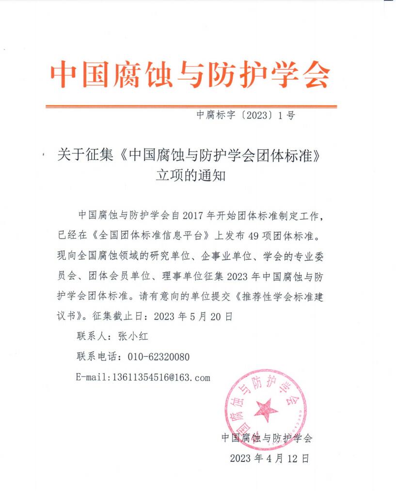 关于征集《中国腐蚀与防护学会团体标准》 立项的通知