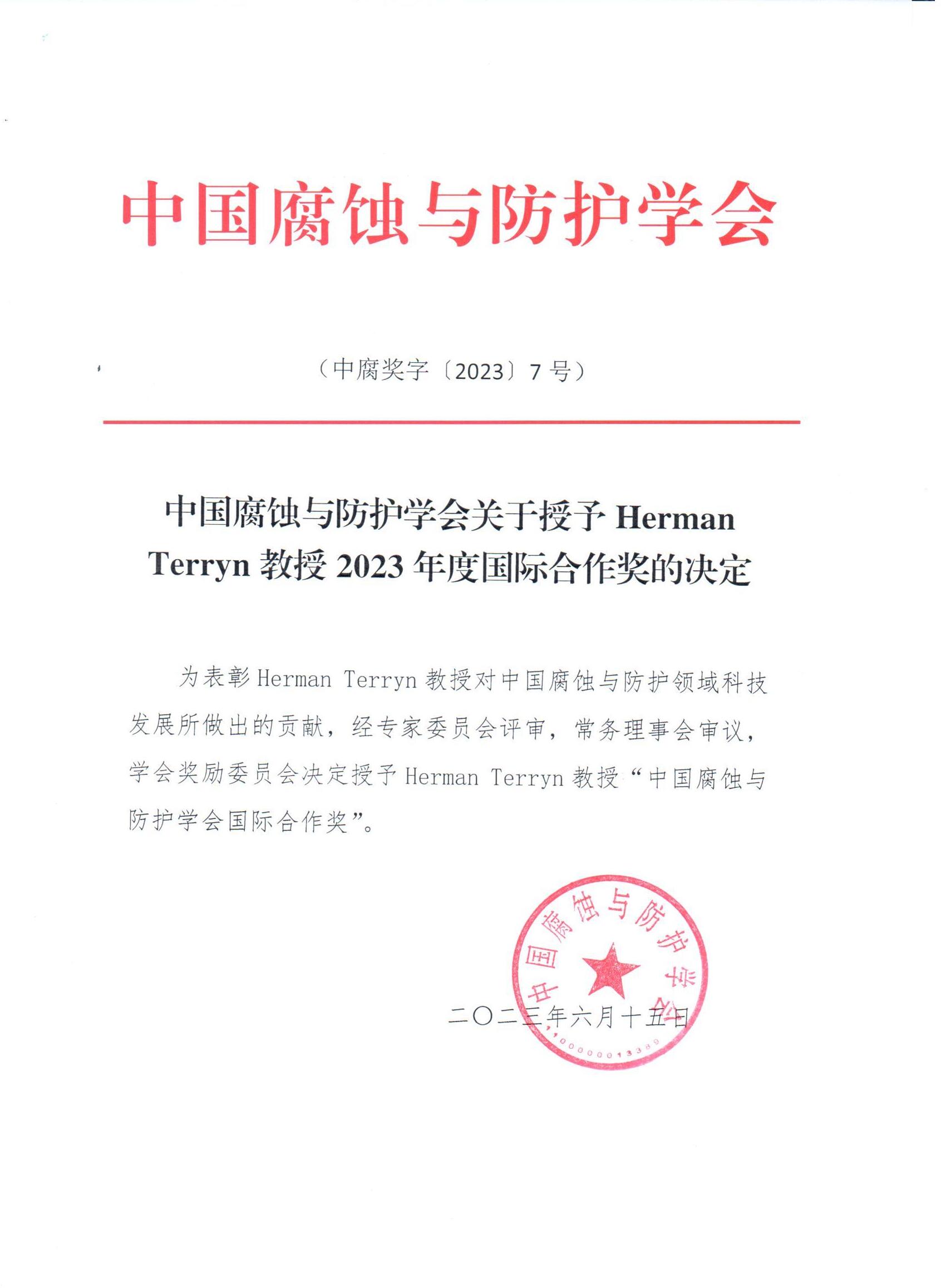 中国腐蚀与防护学会关于授予Herman Terryn教授2023年度国际合作奖的决定