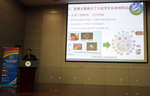 竞赛组织委员会副主任国家科技基础条件平台中心副主任吕先志在会上对第二届“共享杯”大学生科技资源共享与服务创新实践竞赛做了总结报告,报告中指出:“共享杯”大学生科技资源共享与服务创新实践竞赛主题鲜明、目的明确,推动科技资源共享服务,挖掘科技资源潜在价值,培养和提升广大青年学子的创新能力,营造全社会科技资源开放共享氛围和文化。在今年的论文相似性查重筛选的过程中,作品的论文重复率超过20%就会被淘汰,他提出了以后竞赛会逐步提出更高的要求。他还提出以后的竞赛可能会有企业参与进来,企业出题能更好地使资源与需求对接,科技成果将更为直接地得到应用。