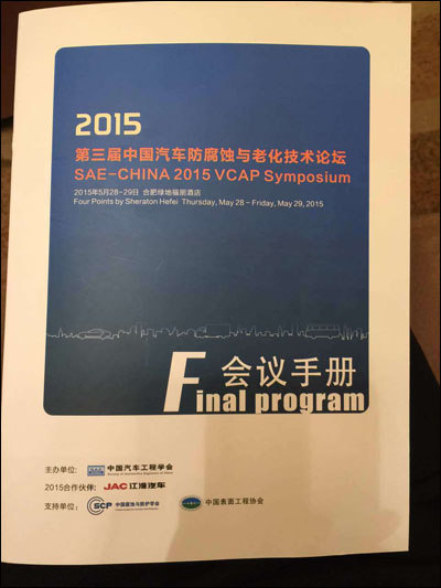 2015第三届中国汽车防腐蚀与老化技术论坛(VCAP论坛)今日在安徽合肥绿地福朋酒店召开,此论坛由中国汽车工程学会主办,安徽江淮汽车有限公司作为2015年度合作伙伴全程参与论