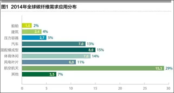 2014年,全球碳纤维区域理论产能达到118000吨,而且各大碳纤维制造商还陆续宣布了大幅扩产计划。国际碳纤维应用市场需求量为53500吨,继续以6%~8%的年增速不断扩大,应用领域进一步拓展,其主要应用领域比例如下:航空航天29%、体育休闲14%、汽车13%、叶片11%、压力容器5%。国际碳纤维产业及下游应用市场均呈现欣欣向荣的景象。