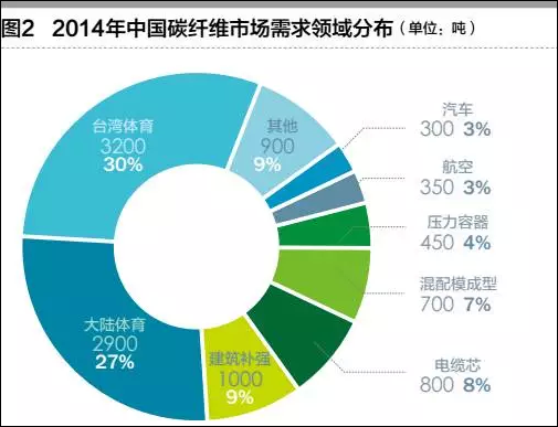 截至2014年底,我国大小碳纤维生产企业有近40家,理论产能19,600吨,实际产量3700吨,主要产品为12K及以下规格小丝束PAN基碳纤维。2014年,国内碳纤维总需求量约1.23万吨,其中,60%应用于体育休闲领域,15%应用于建筑领域,8%应用于电力(电缆)领域,3%应用于航空航天。