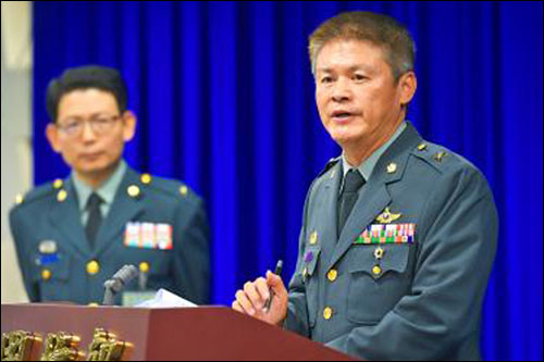 黃國明少将(右)针对新购波音AH-64E阿帕奇直升飞机腐蚀问题答记者问