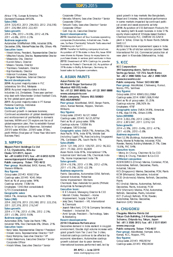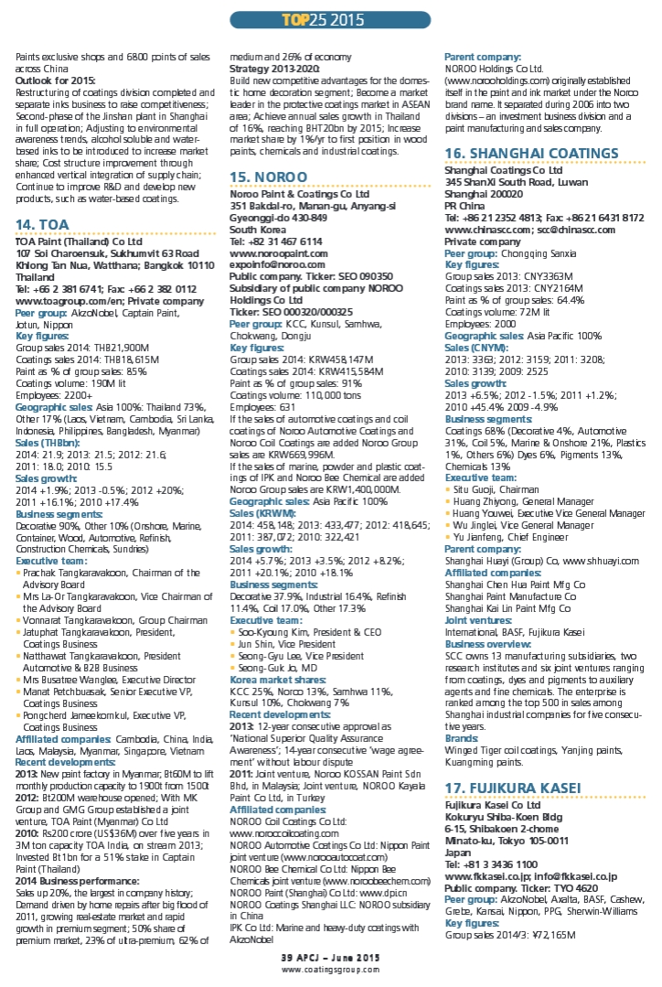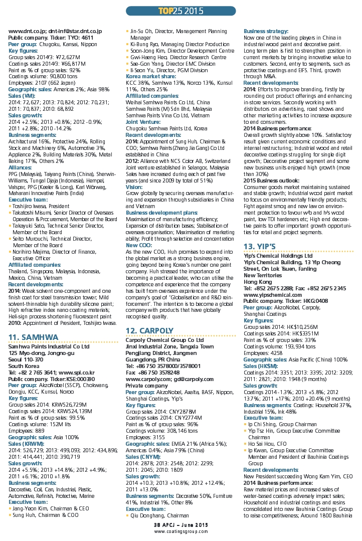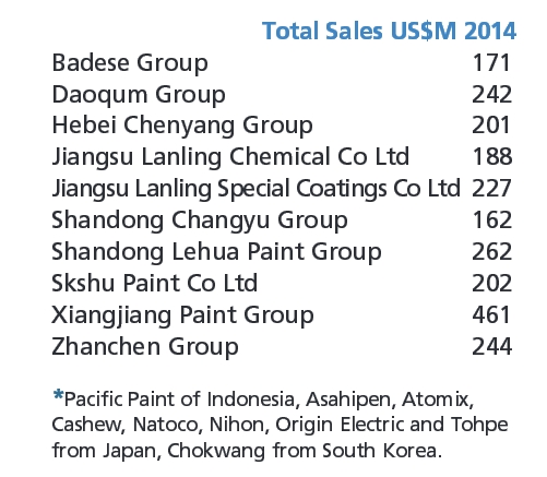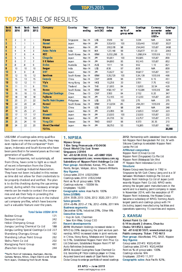 近日,《亚太涂料杂志》(APCJ)公布了“2014年亚太地区涂料企业25强”榜单。此外,还公布了“2014年亚太地区涂料制造企业20强”榜单,该榜单是在亚太地区经营的全球性企业,只计算企业在亚太地区的2014年度销售数据。