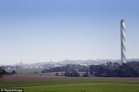 蒂森克虏伯公司的结构就运用到了磁悬浮技术,使得电梯轿厢可迅速平稳地在水平与垂直方向运行。皮尔森博士相信,到本世纪中叶,超高建筑物将高达数千米,有些超大建筑物将具备类似小城市的运作功能。图中是蒂森克虏伯公司的测试塔。