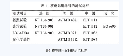 在世界核电站建设中,应用于核岛的涂料标准规范主要按法国NF和美国ASTM执行,尽管很多国家有自己的标准,比如中国的EJ标准。美国和法国的标准基本原理和测试方法相同,但是在试验温度压力特征曲线、喷淋液、试样等方面有所不同。
