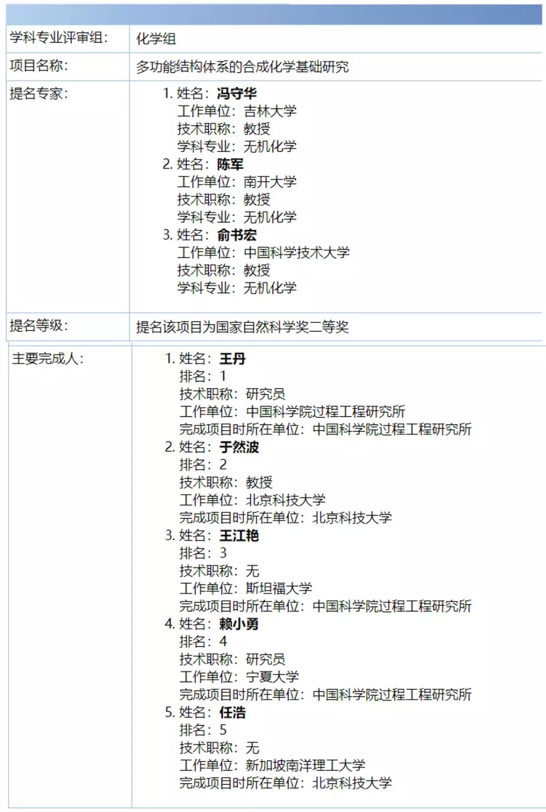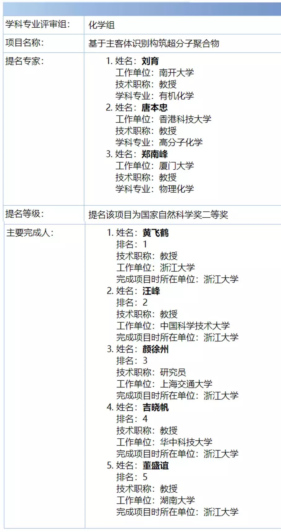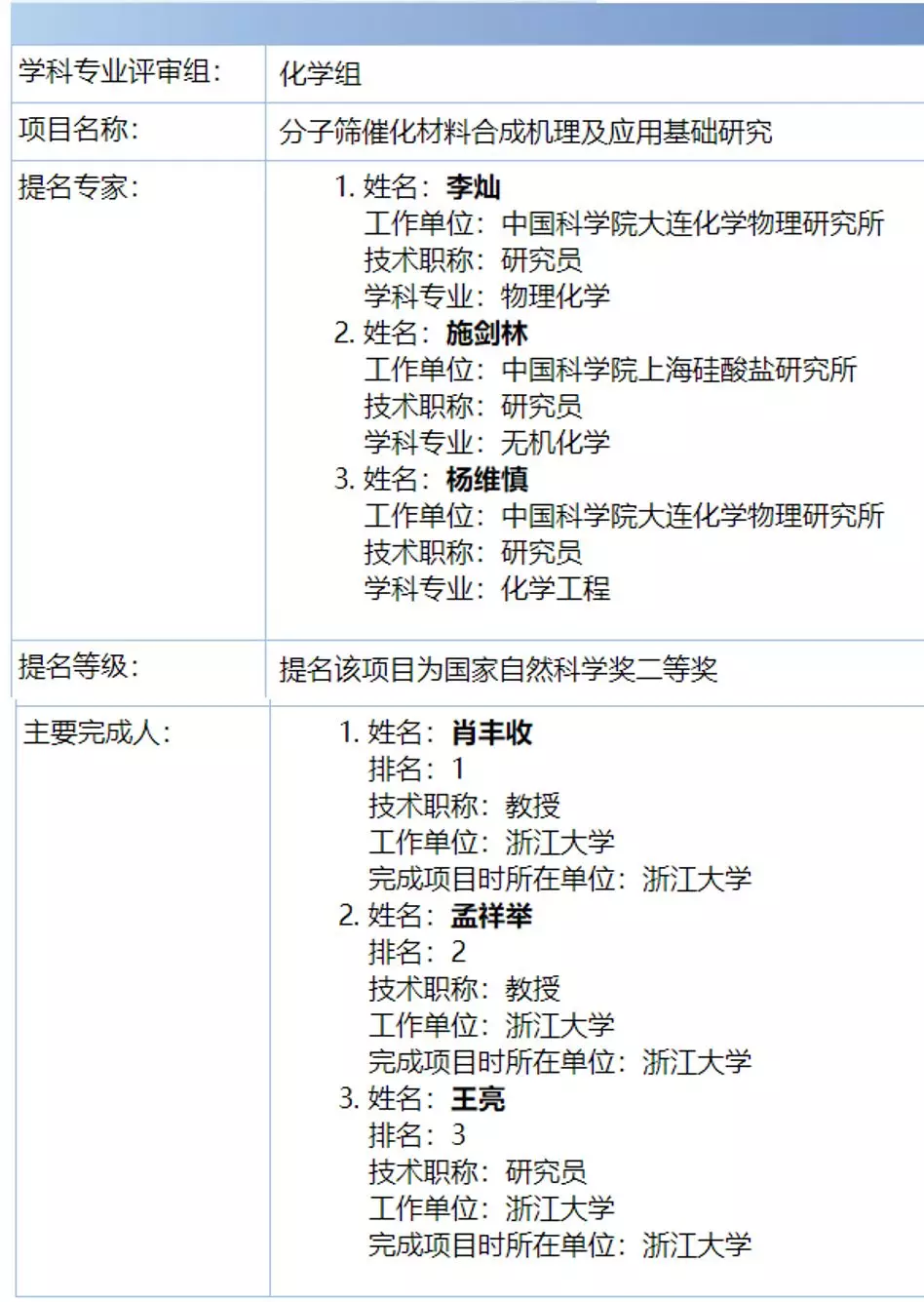 重磅丨2020年度国家科学技术奖励材料和化学组受理项目名单出炉!
