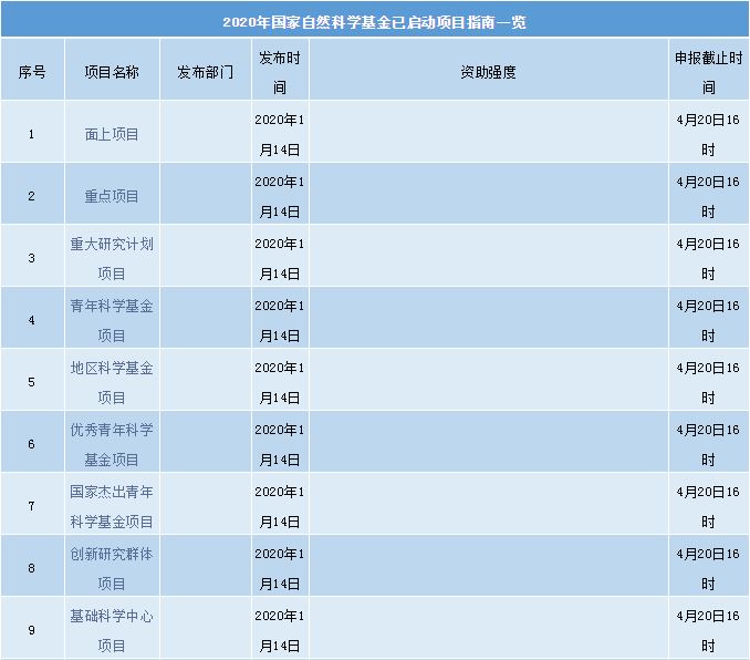 今天是多数国自然基金的截至时间,为了方便大家充分了解各项目情况,动源君将已启动项目从资助强度、申报截止时间、发布部门、发布日期四个方面将近期发布的基金指南情况做了汇总,数据均来源于国家自然科学基金委员会官网,供读者参考。