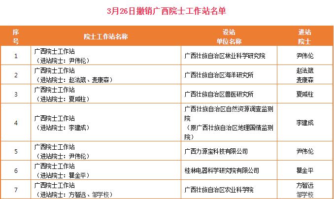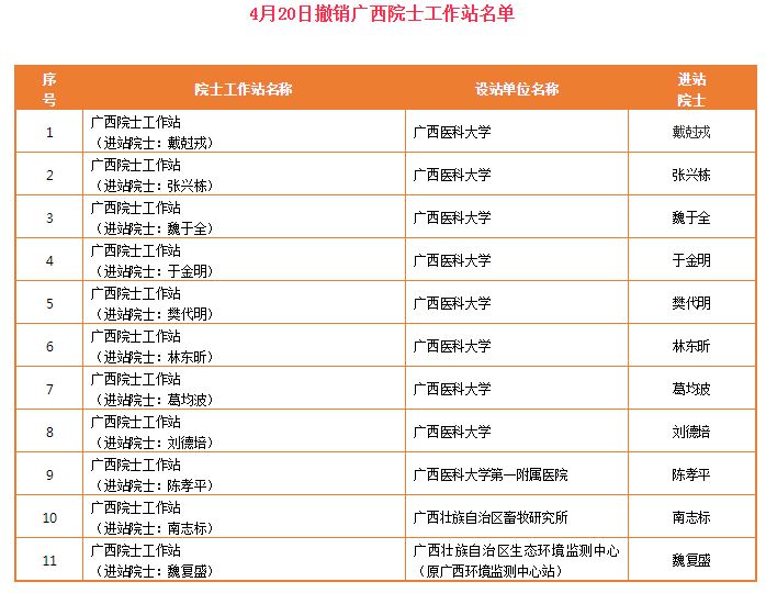 今日,广西科技厅网站公布了一批将撤销的院士工作站,经研究,决定撤销广西医科大学等3家单位建设的11家广西院士工作站。加上3月份撤销的12家,今年以来,广西共撤销了33家院士工作站!