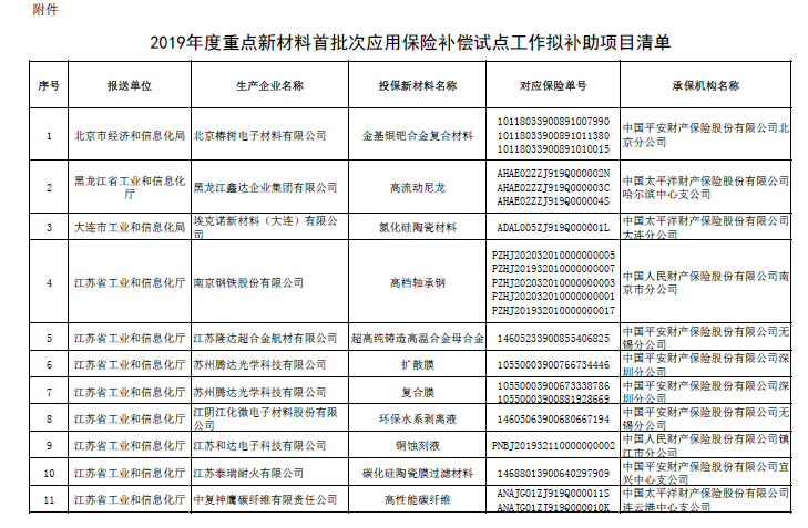 根据《工业和信息化部办公厅 银保监会办公厅关于开展2019年度重点新材料首批次应用保险补偿机制试点工作的通知》(工信厅联原函〔2019〕248号),现将2019年度重点新材料首批次应用保险补偿机制试点工作拟补助项目进行公示,请社会各界监督。