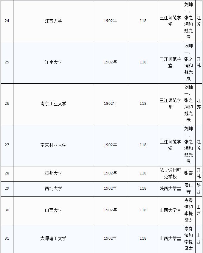 此外,创办于1902年的大学最多,共有17所。其中,南京大学、南京师范大学、南京农业大学、东南大学、江苏大学、江南大学、南京工业大学、南京林业大学等8所大学都源于刘坤一、张之洞和魏光焘创立的三江师范学堂;