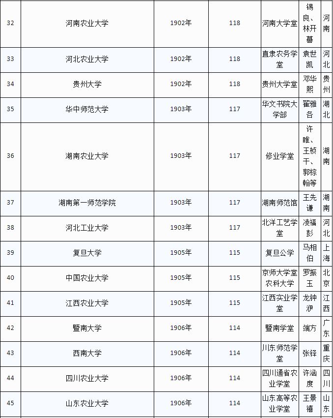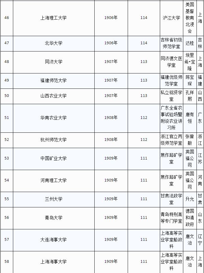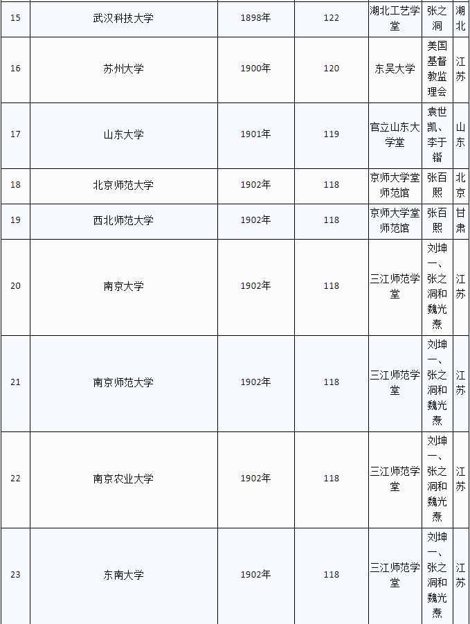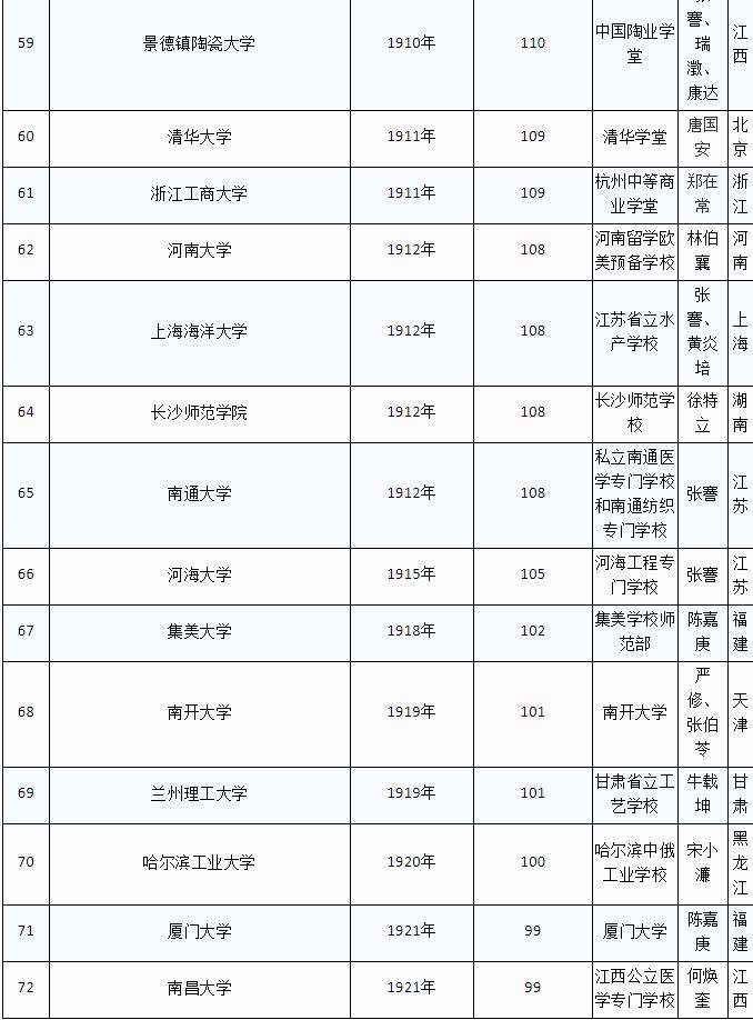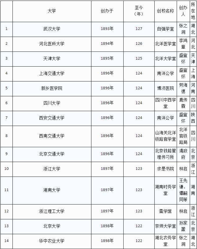 (注:1、资料来源于各校官网,部分创办人资料来源于网络,欢迎网友们勘误。2、华中科技大学、温州医科大学、天津工业大学等,也可追溯至百年,但其官网未提“百年校庆”,则不收录;部分大学如燕山大学、西安工程大学等,虽可溯源至百年前,但在此也未收录。)