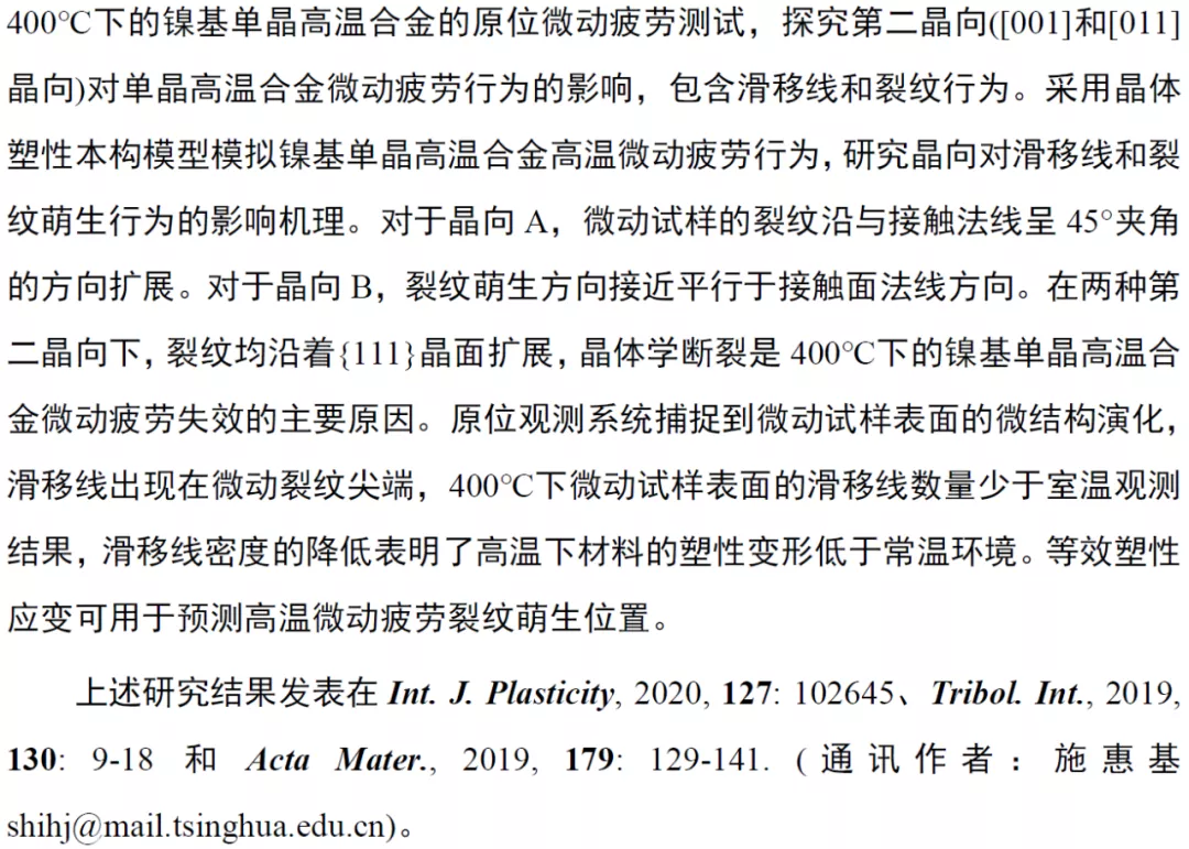 【科研进展】镍基单晶高温合金实时微动疲劳观测和晶体塑性模拟