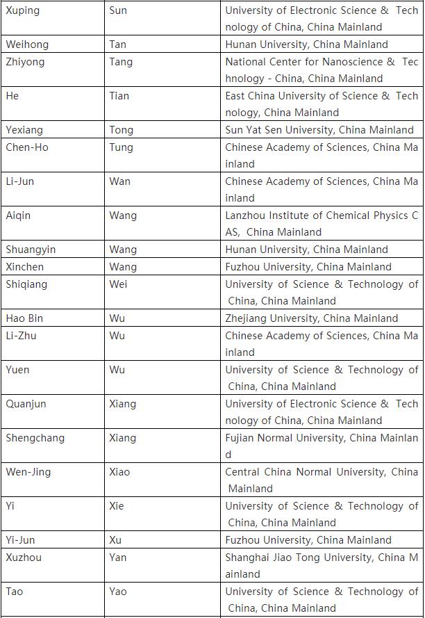 化学领域,中国内地总共有80人入选,其中中国科学院17人。在高校中,中国科学技术大学与清华大学入选人数最多,分别为7人和6人。下面是前三高校中的老师。