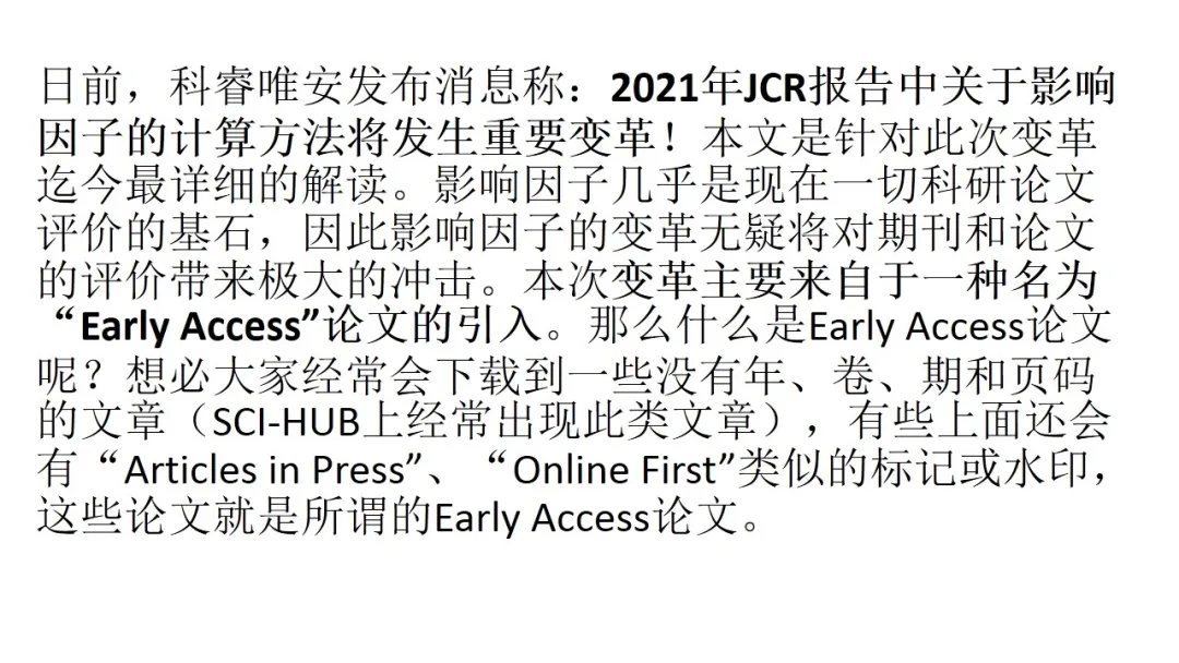 相对于2020IF,这个公式的分母中将引入Early Access出版日期为2020的论文,而分子则只剩下正式出版日期为2020的非Early Access论文和Early Access出版日期为2020的论文。因此,分母增大而分子减小,所以2021IF又要普遍下跌了。