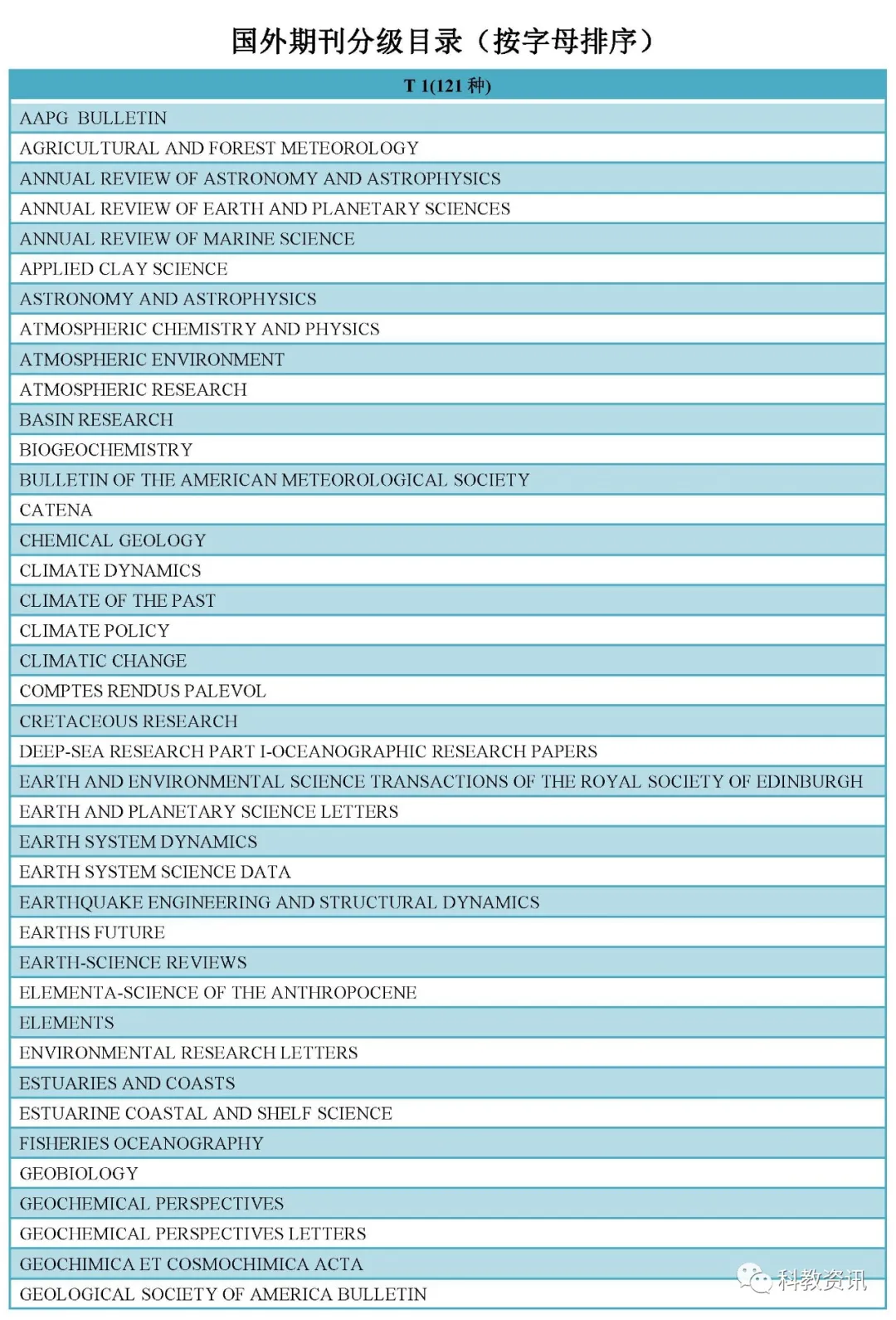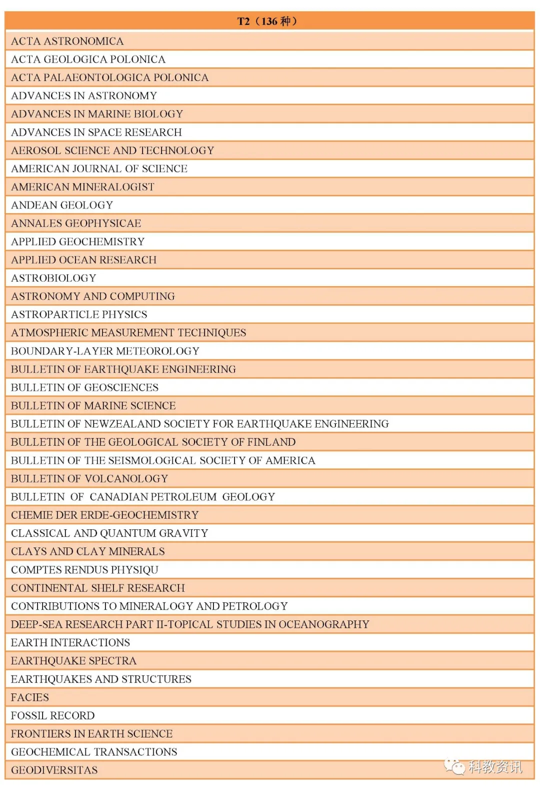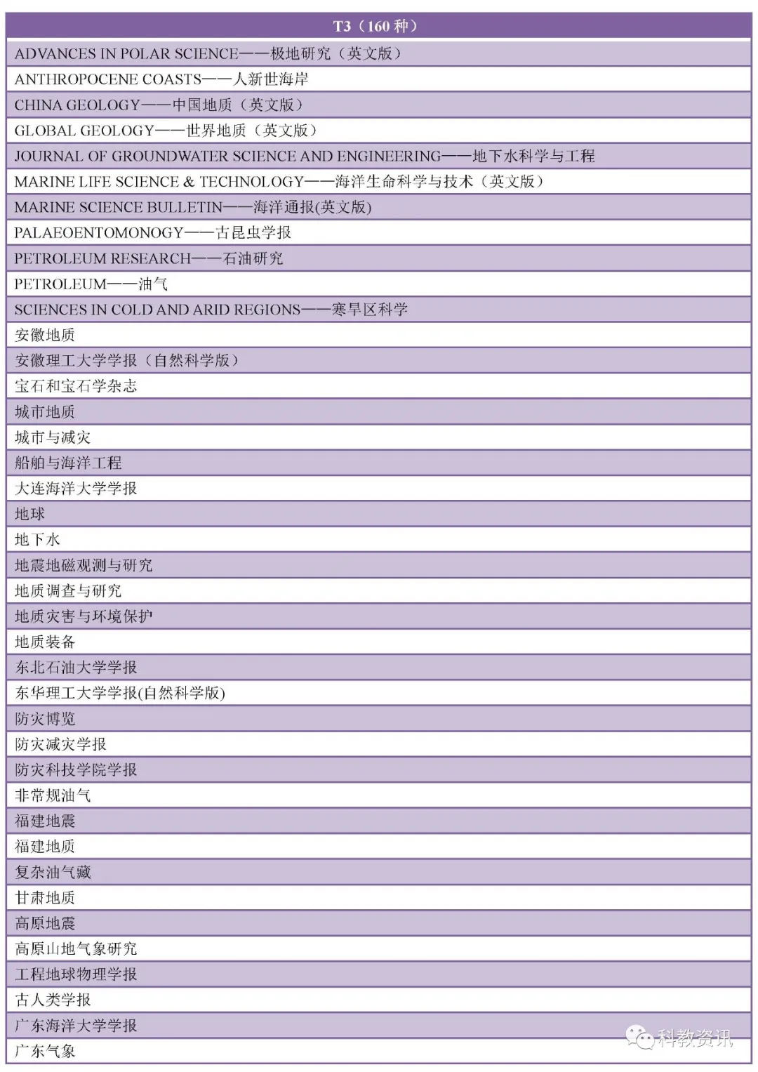2020年7月3日,中国地质学会网站发布了我国地学领域高质量科技期刊分级目录试点成果,《目录》共有359种国内和258种国外期刊入列。其中国内期刊T1类57种、T2类142种、T3类160种。