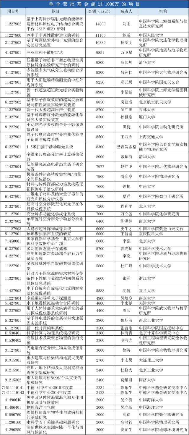 进一步,我们对这些科学家获得的项目进行分析,并整理出单项基金资助额度超过1000万的项目共117项。这些项目大多数是大科学装置或试验项目,因此资助力度很大,这也是诸多科学家上榜的原因。
