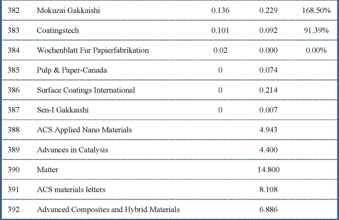 新刊方面,除开前面提到的Matter外,ACS materials letters为8.108,Advanced Composites and Hybrid Materials为6.886,ACS Applied Nano Materials为4.943,Advances in Catalysis为4.400。