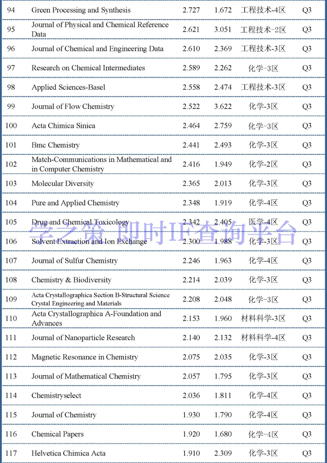 目前Q2和Q3的分界线两端是Journal of Chemical Education(即时2.894)和Journal of Chemical Technology and Biotechnology(即时2.824)。Q3和Q4分界线的两端是Journal of Chemical Sciences(即时1.398)和Monatshefte Fur Chemie(即时1.391)。