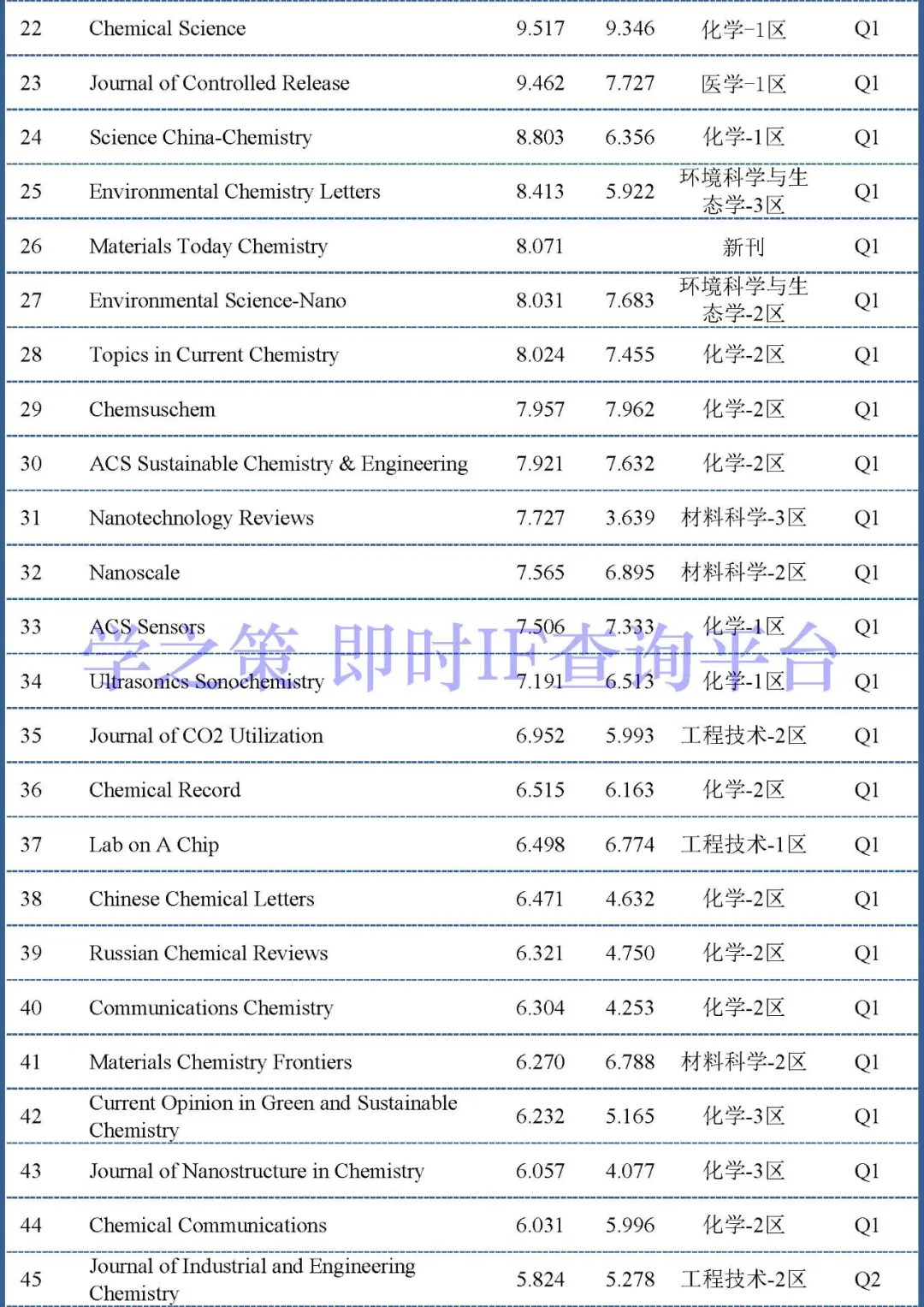 有两本新期刊进入了Q1,分别是Trends in Chemistry(即时22.500)和Materials Today Chemistry(即时8.071)。