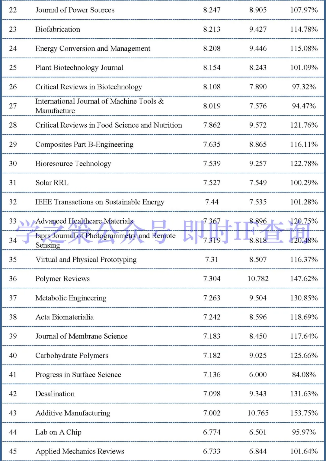 涨幅较大的期刊(非国产)有:Nature Biotechnology(52.064,完成度142.42%);Nature Biomedical Engineering(24.452,完成度129.02%);Trends in Biotechnology(18.386,完成度128.18%);Biotechnology Advances(13.665,完成度127.19%);Cement and Concrete Research(10.629,完成度127.63%),Polymer Reviews(10.782,完成度147.62%),Metabolic Engineering(9.504,完成度130.85%),等。
