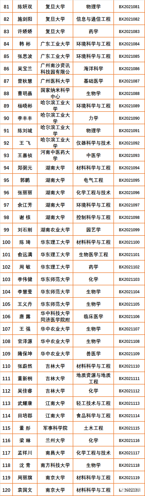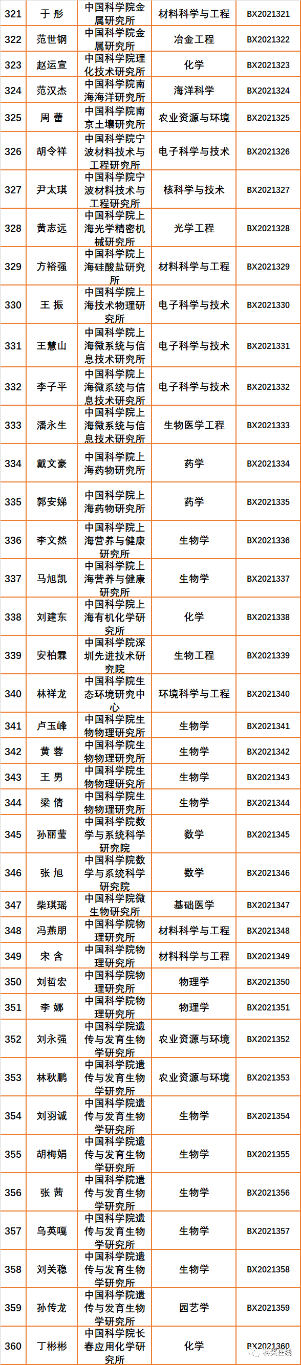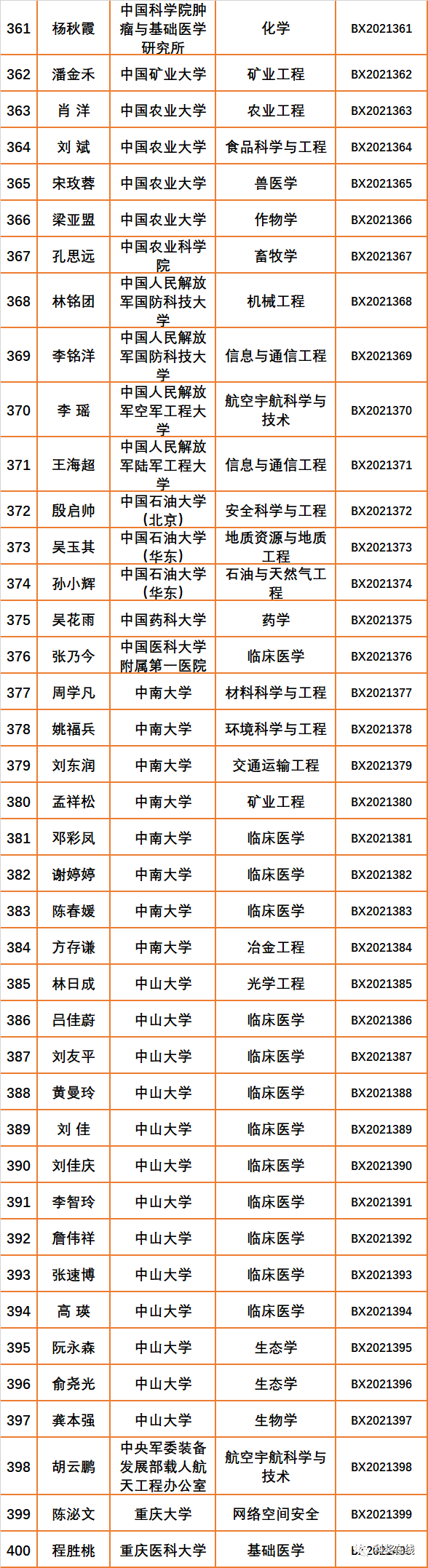 根据《全国博士后管委会办公室关于做好2021年度博士后创新人才支持计划实施工作的通知》,全国博士后管委会办公室、中国博士后科学基金会组织开展了2021年度博士后创新人才支持计划(以下简称“博新计划”)的申报和评审工作,最终确定了400名获选人员。名单如下: