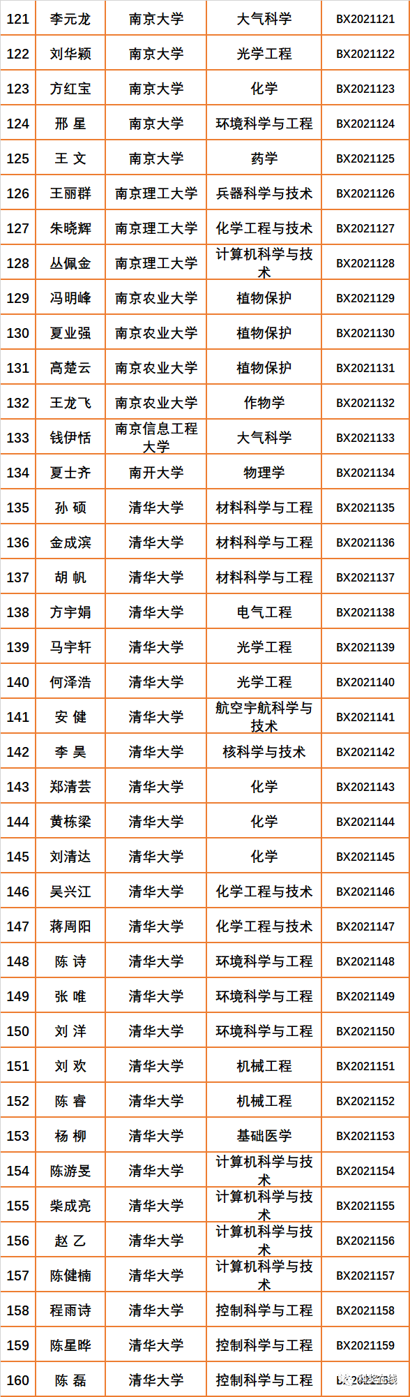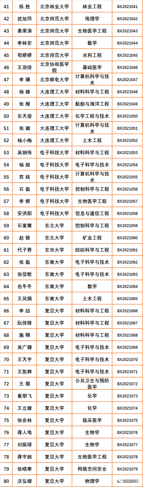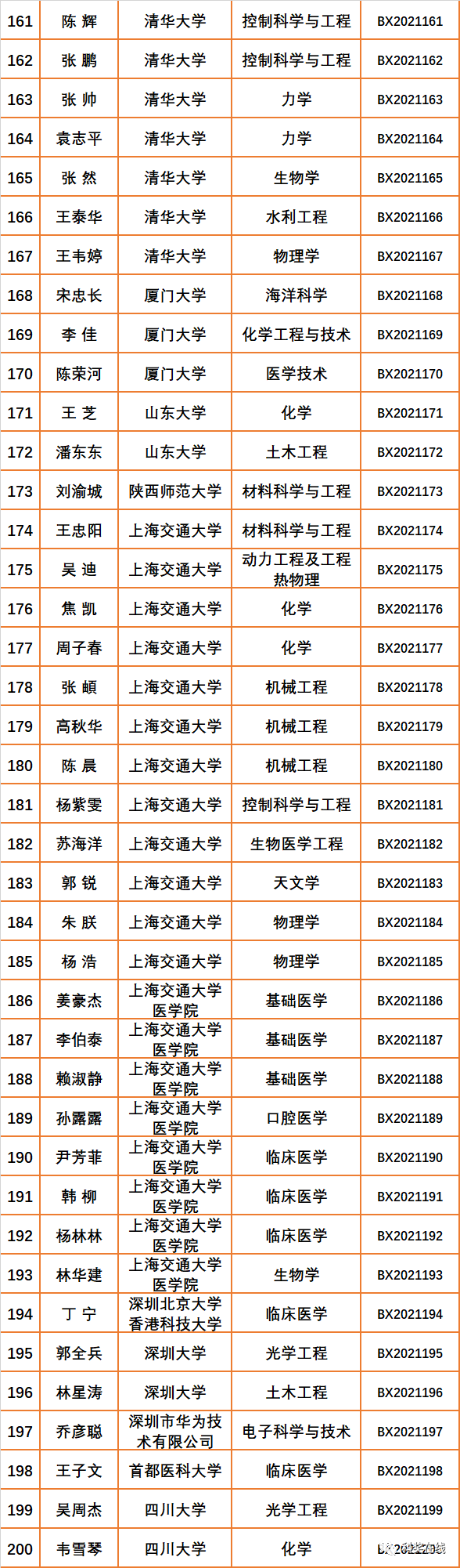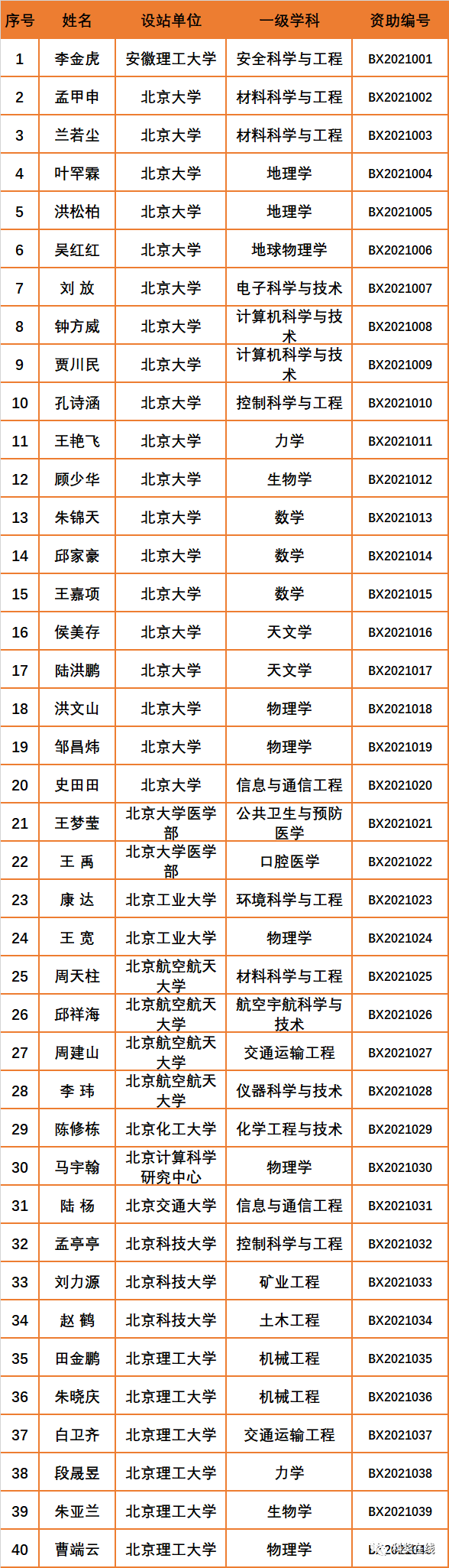 根据《全国博士后管委会办公室关于做好2021年度博士后创新人才支持计划实施工作的通知》,全国博士后管委会办公室、中国博士后科学基金会组织开展了2021年度博士后创新人才支持计划(以下简称“博新计划”)的申报和评审工作,最终确定了400名获选人员。名单如下: