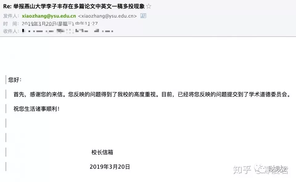3月20日,燕山大学官方回信表示高度重视并已经提交到学术道德委员会