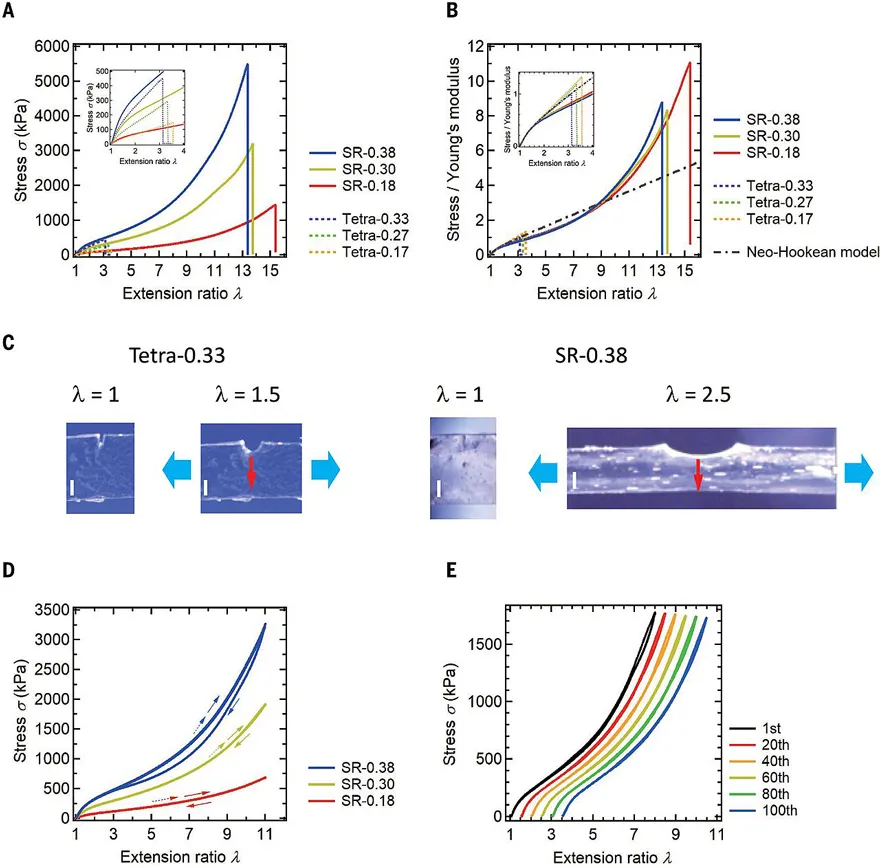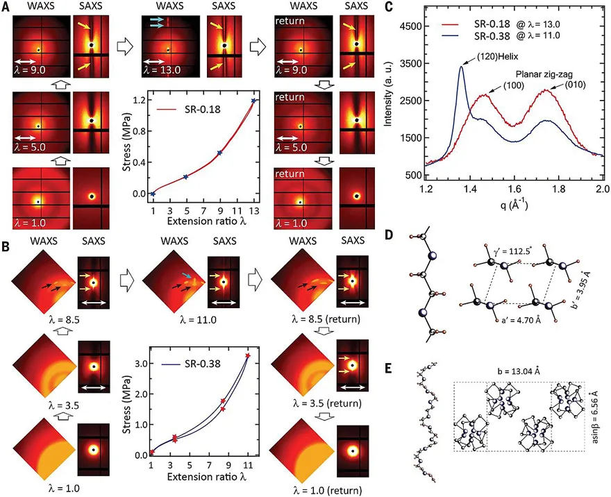 为了证明这些猜测,研究者对材料进行小角X射线散射(SAXS)分析。在拉伸时,由于滑动环作用,使得混乱的聚乙二醇平行取向排列,并在应变诱导下结晶,使得水凝胶变硬,小角X射线散射图案中观察到尖锐条纹。但当应变释放时,它们会很快恢复到凝胶的柔性状态,应变诱导结晶相消失。这与天然橡胶的拉伸恢复过程相似,也因此具有和天然橡胶一样良好的循环拉伸性能。
