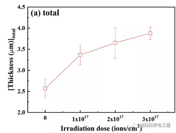 图3 T91钢的氧化膜厚度随辐照剂量的变化(温度450℃、流速5m/s、压力10MPa、氧含量5ppb)