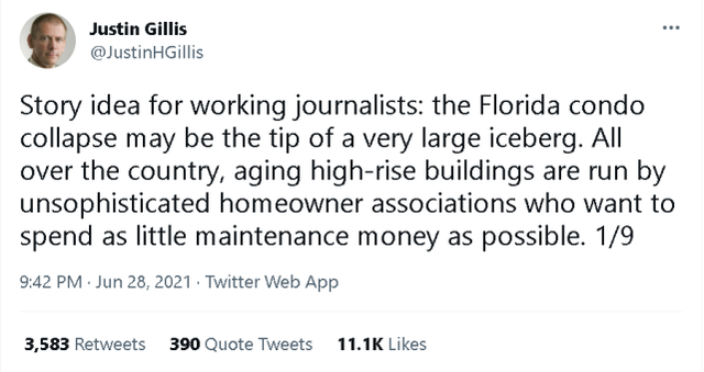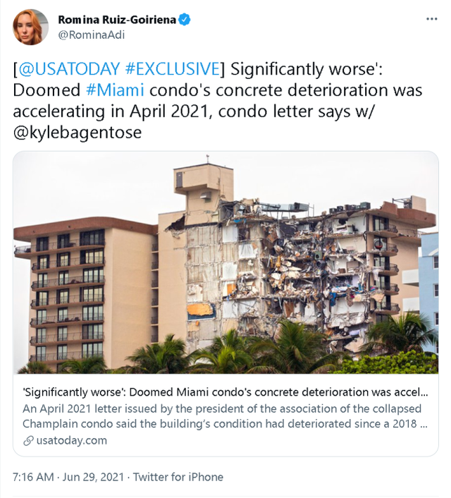 可让人不由得为美国人感到“不寒而栗”的是,美国很多公寓楼等建筑,其实都在面临日趋老化的问题。就像下面这位美国媒体人所说,迈阿密这起惨案以及所暴露出的许多问题,恐怕只是“一块巨大冰山的一角”。
