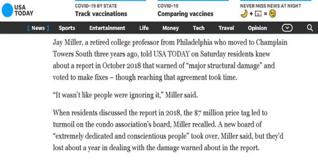 如下图所示,在《今日美国》的一位记者在社交网络上发布了介绍业主们在楼塌前一直纠结修理费用的报道后,评论里就有不少留言认为虽然遇难的业主们很值得同情,但不愿意付钱的他们也并不是没有问题。