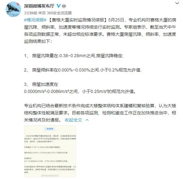 5月25日,专业机构对赛格大厦的房屋沉降、倾斜率、加速度等情况持续进行实时监测。专家组表示,截至当天中午各项监测数据正常,未超出相应标准要求。赛格大厦房屋沉降、倾斜率、加速度监测结果如下: