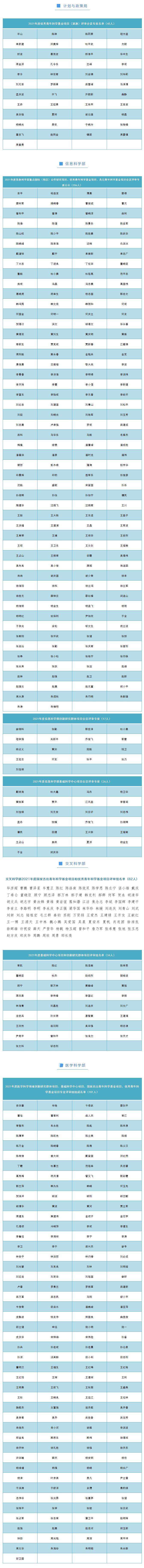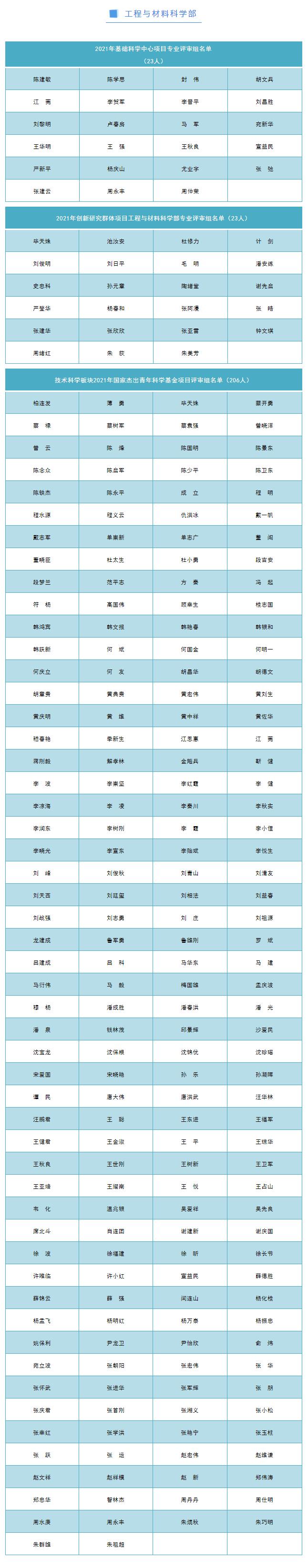 截至目前,已有九个学部公示了部分项目的评审组专家名单,共2368人。其中:工程与材料科学部公布2021年基础科学中心项目专业评审组名单23人。创新研究群体项目专业评审组名单23人,国家杰出青年科学基金项目评审组名单206人。化学科学部公布2021年度基础科学中心项目、创新研究群体项目、专项项目(科技活动项目)、国家杰出青年科学基金项目、优秀青年科学基金项目、面上项目、青年科学基金暨地区科学基金项目、重点项目、重点国际(地区)合作研究项目评审会专家611人。