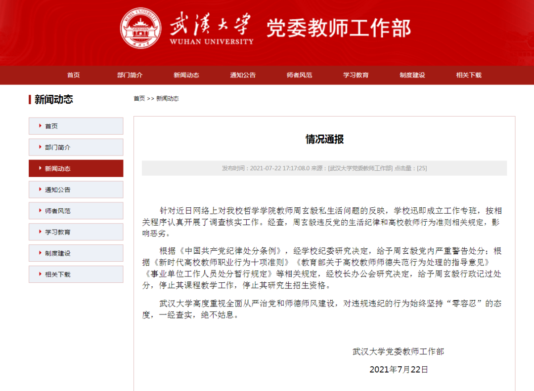 7月22日,武汉大学党委教师工作部发布情况通报:哲学学院教师周玄毅违反党的生活纪律和高校教师行为准则相关规定,影响恶劣。给予周玄毅党内严重警告处分;给予周玄毅行政记过处分,停止其课程教学工作,停止其研究生招生资格。