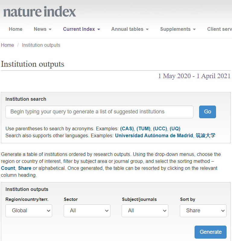 2021年7月24日,Nature指数公布了2020年5月1日到2021年4月1日大学/机构排名,也就是说最新的一期机构/大学的学术排名正式出炉。