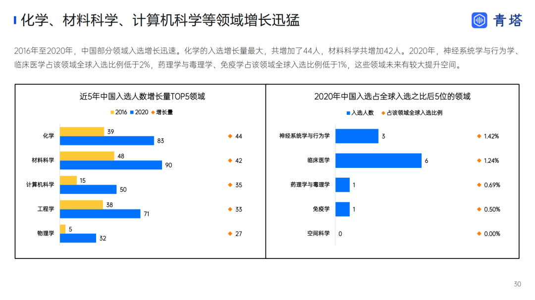 2016年至2020年, 中国部分领域入选增长迅速。化学的入选增长量最大, 共增加了44人, 材料科学共增加42人。2020年, 神经系统学与行为学、临床医学占该领域全球入选比例低于2%, 药理学与毒理学、 免疫学占该领域全球入选比例低于1%。