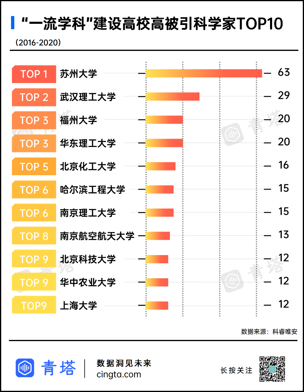“一流学科”建设高校中,苏州大学力拔头筹,5年共入选高被引科学家63人次,表现超过众多“一流大学”建设高校。除此之外。武汉理工大学、福州大学、华东理工大学等高校也有出色表现。
