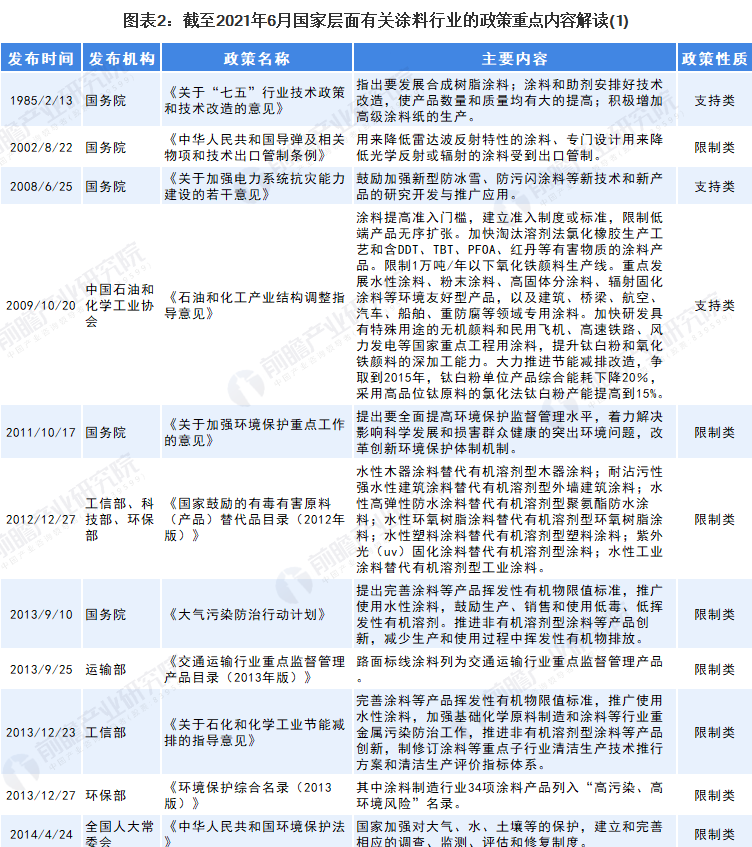 我国对于涂料行业的相关政策主要集中在环保以及新材料等领域。例如,禁止使用高VOCs含量的溶剂型涂料,推广水性涂料等低VOCs含量涂料,鼓励外商投资高性能涂料等相关项目。截止2021年6月,我国涂料行业相关政策及规划如下: