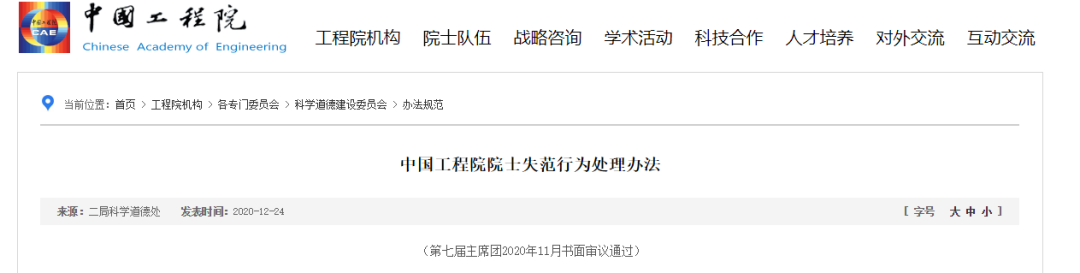 早在去年12月,中国工程院就发布了《中国工程院院士失范行为处理办法》。