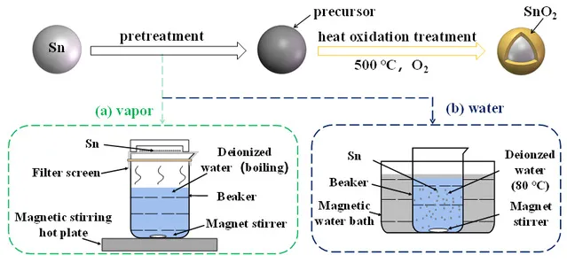 Sn@SnO2相变微胶囊的制备流程:(a)水蒸汽预处理,(b)水煮预处理