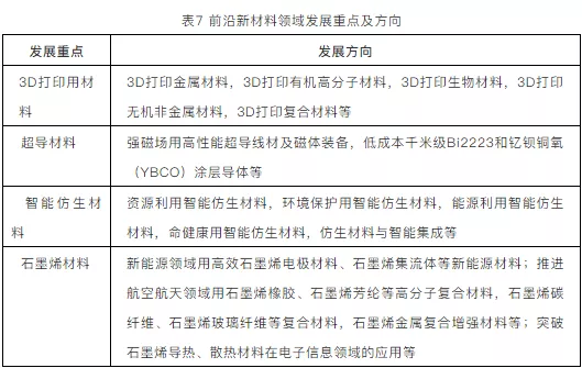 前沿新材料领域发展重点及发展方向主要包括3D 打印用材料、超导材料、智能仿生材料、石墨烯材料等(见表7)。