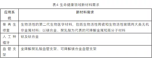 随着全球人口老龄化日益加剧,人们对自身健康的关注度不断提高,健康产业进入加速发展时期。生物医用材料的快速突破,将在疾病快速诊断、人体器官修复移植方面为人类带来福祉,对国家的医疗安全、人民健康产生至关重要的影响,生命健康领域新材料需求见表4。