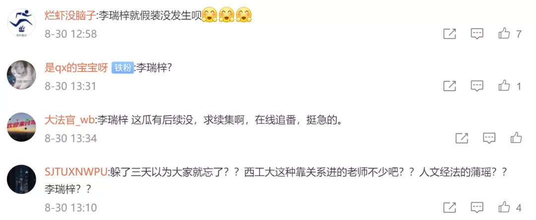 但不得不说,西工大暂时表现还是很不错的,虽然微博下面有一堆关于李瑞梓事件的质疑,甚至冷嘲热讽,但西工大并没有关闭评论。由于西工大的声誉,它不能被忽视。我们希望对此事能尽快得到正式答复。