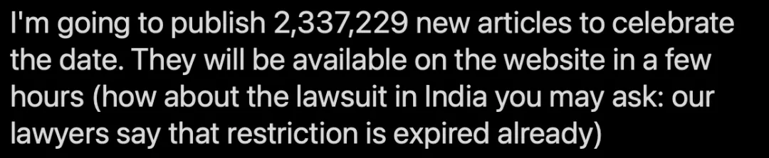 9月5日,Sci-Hub十岁了!在这个值得纪念的日子里,Sci-Hub的限制被解除了!创始人Alexandra Elbakyan更是上传了超过233万篇新论文,让Sci-Hub中的文章达到了近8800万。