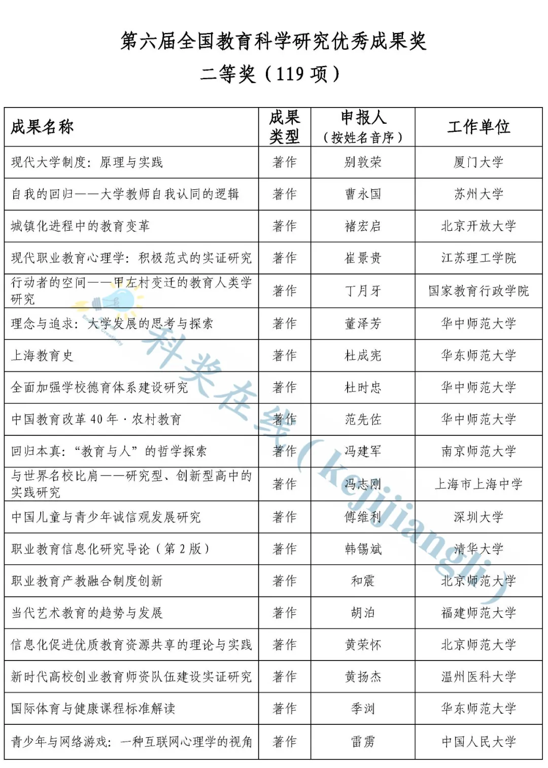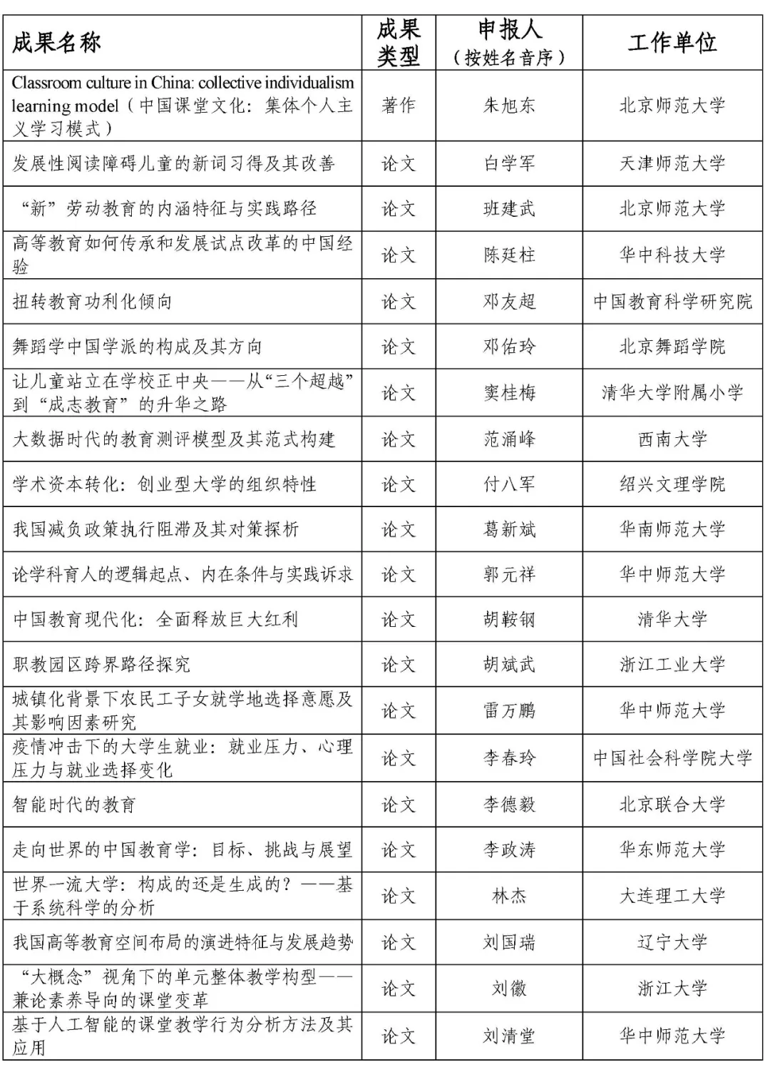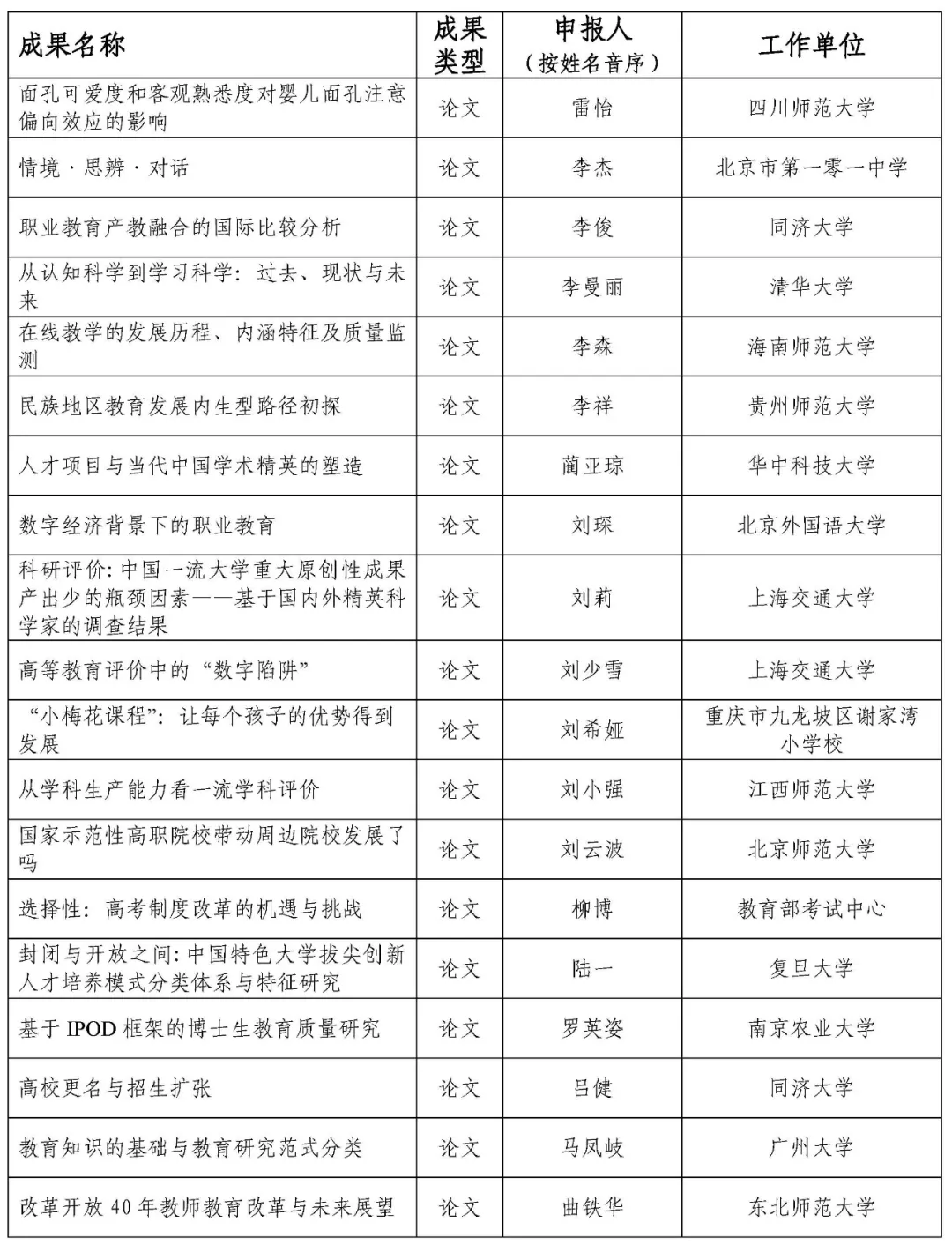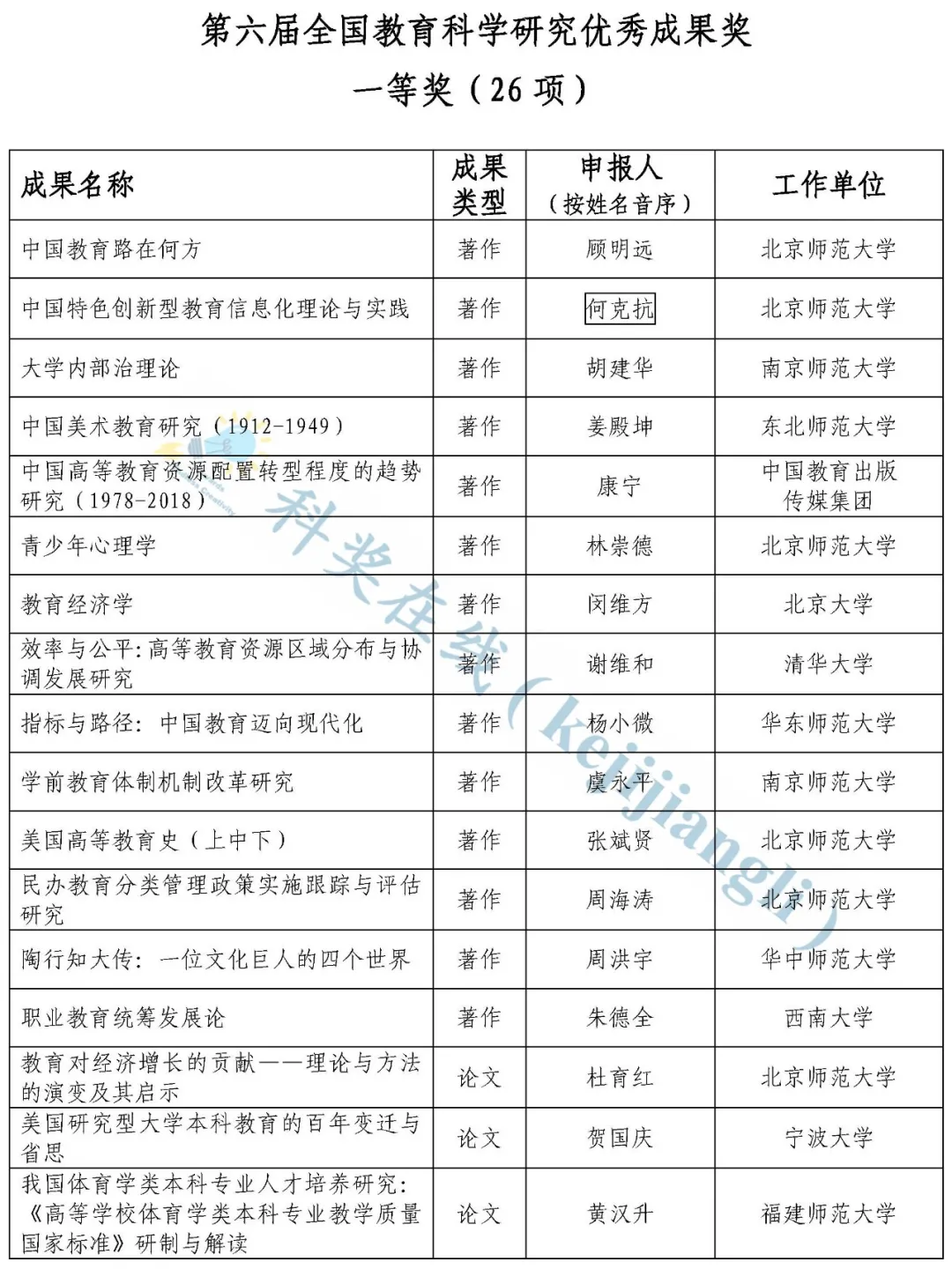 根据《第六届全国教育科学研究优秀成果评选奖励实施办法》规定,经评审,共评选出获奖成果344项,其中一等奖26项,二等奖119项,三等奖199项。现将评选结果进行公示。