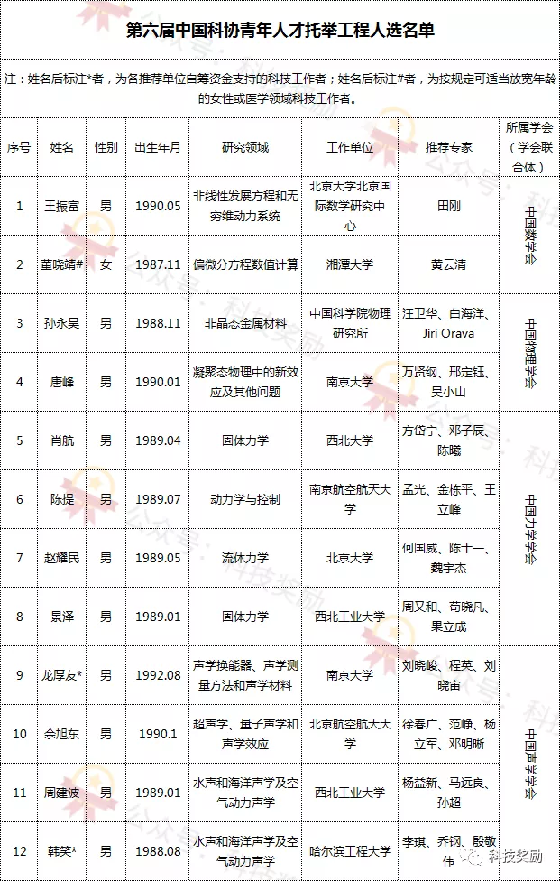 按照第六届中国科协青年人才托举工程项目立项要求,各立项单位共遴选出第六届中国科协青年人才托举工程人选400人(不包含特殊科技领域人选)。根据《中国科协青年人才托举工程实施管理细则》规定,现对这400名人选名单予以公示,公示期为2021年9月9-15日。