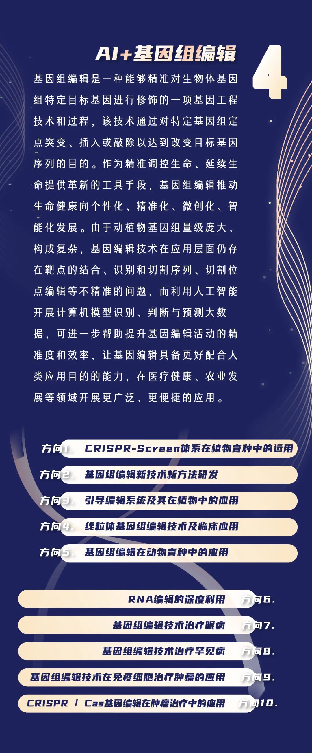面向AI+基因组编辑领域,报告认为作为精准调控生命并提供延续生命革新性工具手段的基因组编辑技术,正推动生命健康向个性化、精准化、微创化、智能化发展。由于动植物基因组量级庞大、构成复杂,基因编辑技术在应用层面仍存在靶点的结合、识别和切割序列、切割位点编辑等不精准的问题,而利用人工智能开展计算机模型识别、判断与预测大数据,可帮助提升基因编辑活动的精准度和效率,让基因编辑具备更好配合人类应用目的的能力,在医疗健康、农业发展等领域具备更广泛的应用前景。