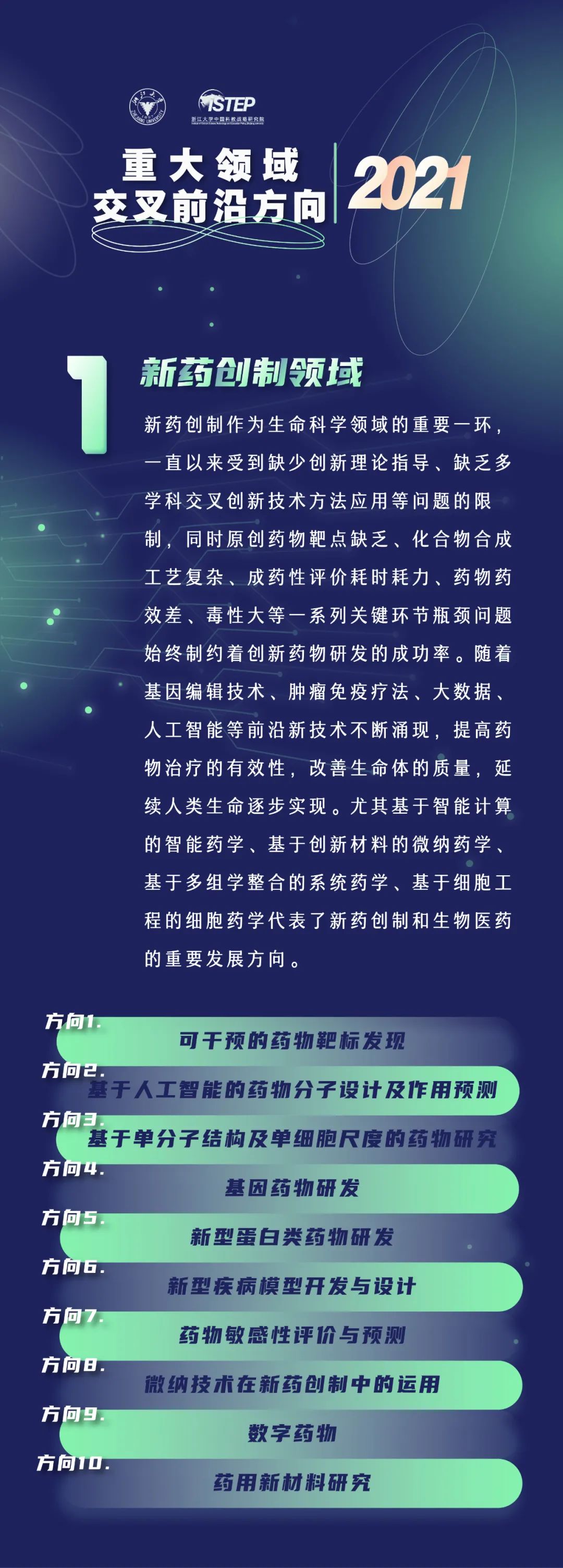 面向新药创制领域,报告认为新药创制是生命科学领域的重要一环,但一直以来受到缺少创新理论指导、缺乏多学科交叉创新技术方法应用等问题的限制,同时原创药物靶点缺乏、化合物合成工艺复杂、成药性评价耗时耗力、药物药效差、毒性大等始终制约创新药物研发的成功率。基因编辑技术、肿瘤免疫疗法、大数据、人工智能等前沿新技术不断涌现,将显著提高药物治疗的有效性,进而改善生命体的质量,逐步实现人类生命延续。尤其基于智能计算的智能药学、基于创新材料的微纳药学、基于多组学整合的系统药学、基于细胞工程的细胞药学代表了新药创制和生物医药的重要发展方向。