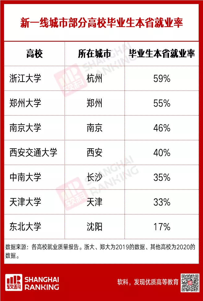 在新一线城市中,西安、长沙、天津等地的名校都只有 30% 左右的毕业生选择留在本省(市)内工作。相比之下,杭州、南京等江浙沪地区的情况较好,毕业生更愿意留下。
